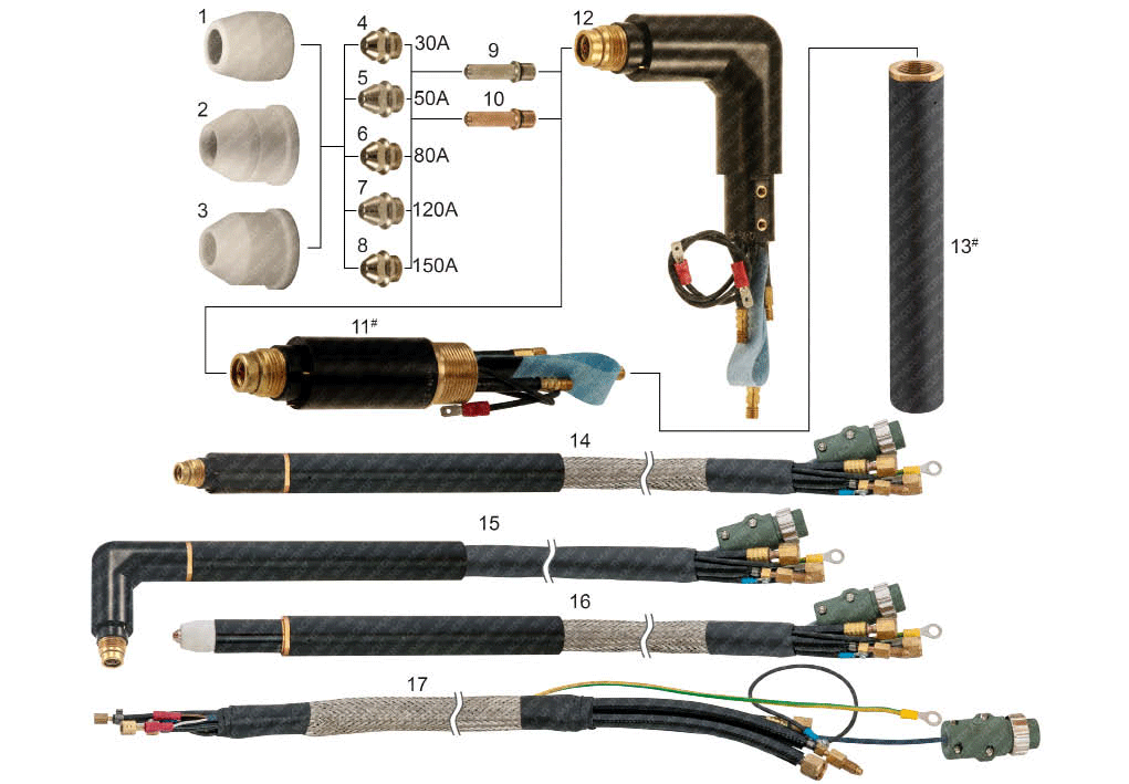 Part No. Ref. No. Description / Tên chi tiết T-1007 H839G02 Chụp bảo vệ / Shield Cup (1) T-5316 H839G02N Chụp bảo vệ / Shield Cup (2) T-5317 H839G02-T Chụp bảo vệ / Shield Cup (3) T-1008 H839K03 Bép cắt plasma 30A / Nozzle, 30A (4) T-1009 H839K02 Bép cắt plasma 50A / Nozzle, 50A (5) T-1011 H839K01 Bép cắt plasma 80A / Nozzle, 80A (6) T-1012 H839G03 Bép cắt plasma 120A / Nozzle, 120A (7) T-5318 H839G04 Bép cắt plasma 150A / Nozzle, 150A (8) T-9593* H839M00-UR Điện cực plasma / Electrode 30–150A, Ni plated (9) H839M00-UR-N Điện cực plasma / Electrode 30–150A (10) T-5315 H839B00 Thân mỏ cắt Plasma cắt tay / Torch Body, Hand, 90˚ (12) T-11295# T-11295 Tay cầm cho mỏ cắt tay / Tube (13) T-1017# H840B00-UR Thân mỏ Plasma cắt máy / Torch Body, Machine (11) KT-1263 K.CTPW-1201.8M Mỏ cắt máy 8M / CTPW-1201 Torch w/ Leads 8m (26’) KT-1049 K.CTPW-1201.10M Mỏ cắt máy 10M / CTPW-1201® Machine Torch w/ Leads 10m (33’) KT-1221 K.CTPW-1201.13M Mỏ cắt máy 13M / CTPW-1201® Machine Torch w/ Leads 13m (42’) KT-1224 K.CTPW-1201.20M Mỏ cắt máy 20M / CTPW-1201® Machine Torch w/ Leads 20m (66’) KT-1314 K.CTZW-1201.10M Mỏ cắt tay 10M / CTZW-1201® Hand Torch w/ Leads 10m (33’) KT-1341 K.CTZW-1201.10M.K Cáp plasma cắt tay 10M / CTZW-1201® Cable Leads, Hand 10m (33’) KT-1222 K.CTPW-1201.13M.K Cáp plasma cắt máy 13M / CTPW-1201® Cable Leads, Machine 13m (42’) KT-1225 K.CTPW-1201.20M.K Cáp cắt máy 20M / CTPW-1201® Cable Leads, Machine 20m (66’)